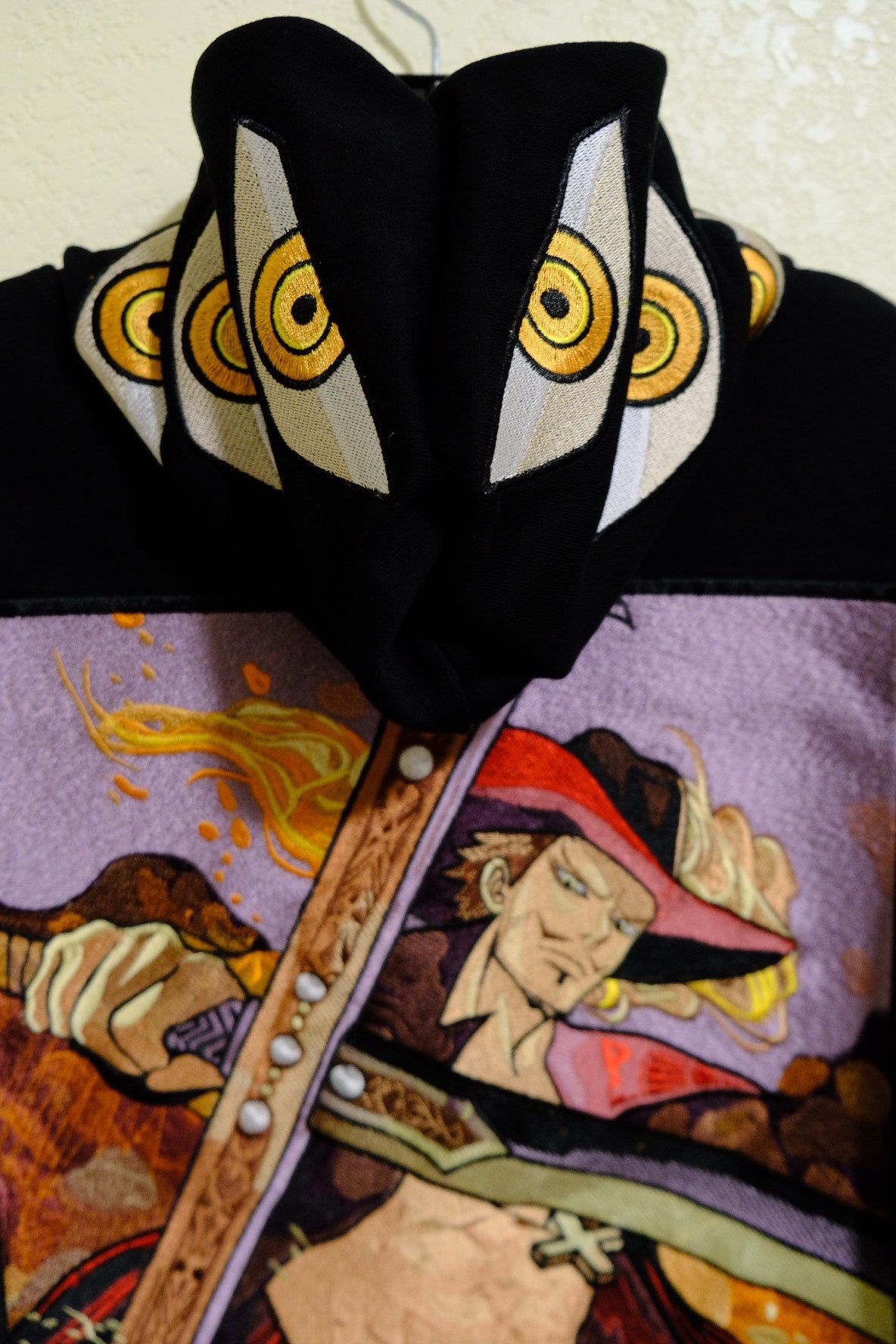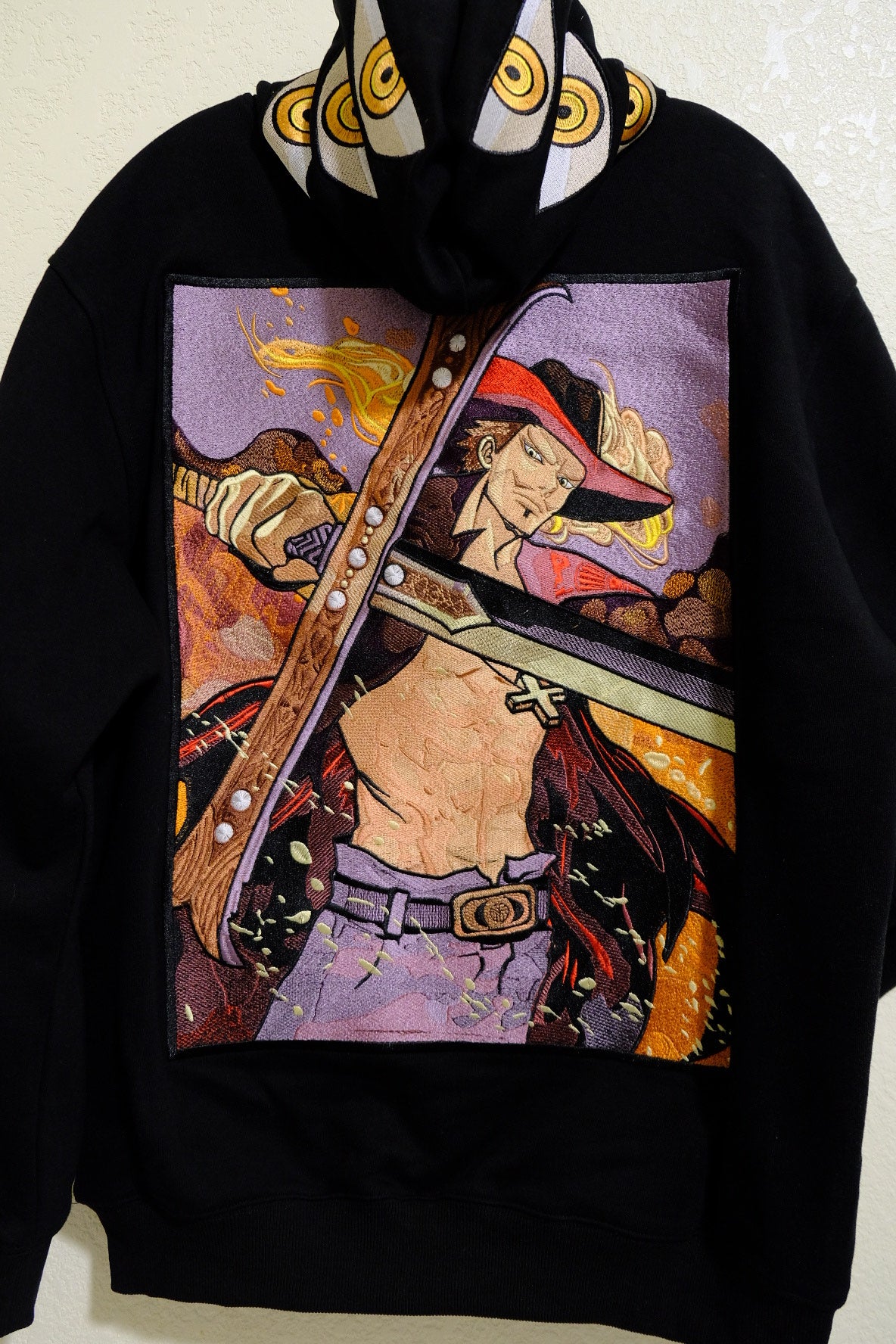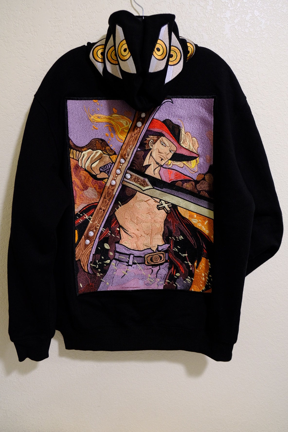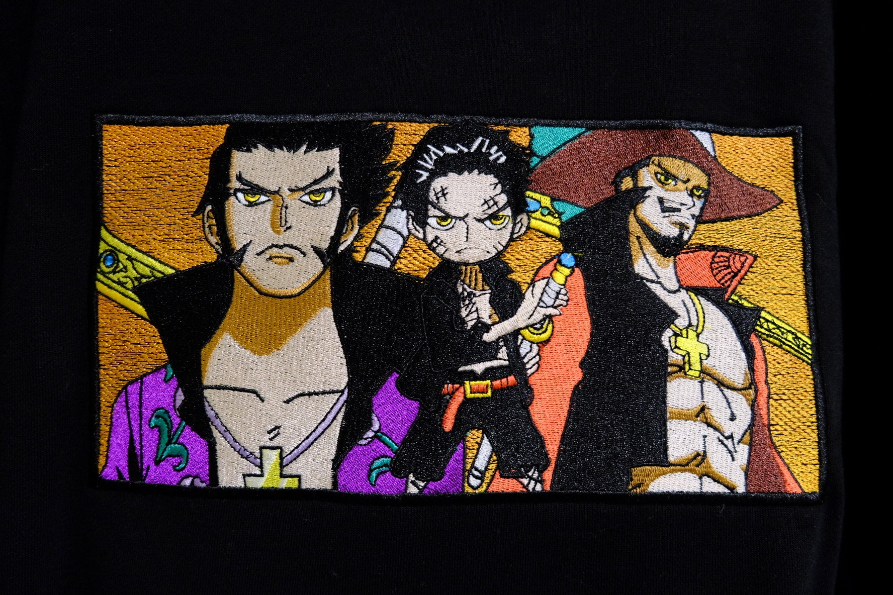- Detailed Embroidery: Showcasing Mihawk's iconic look, featuring intricate stitching that reflects his masterful presence.