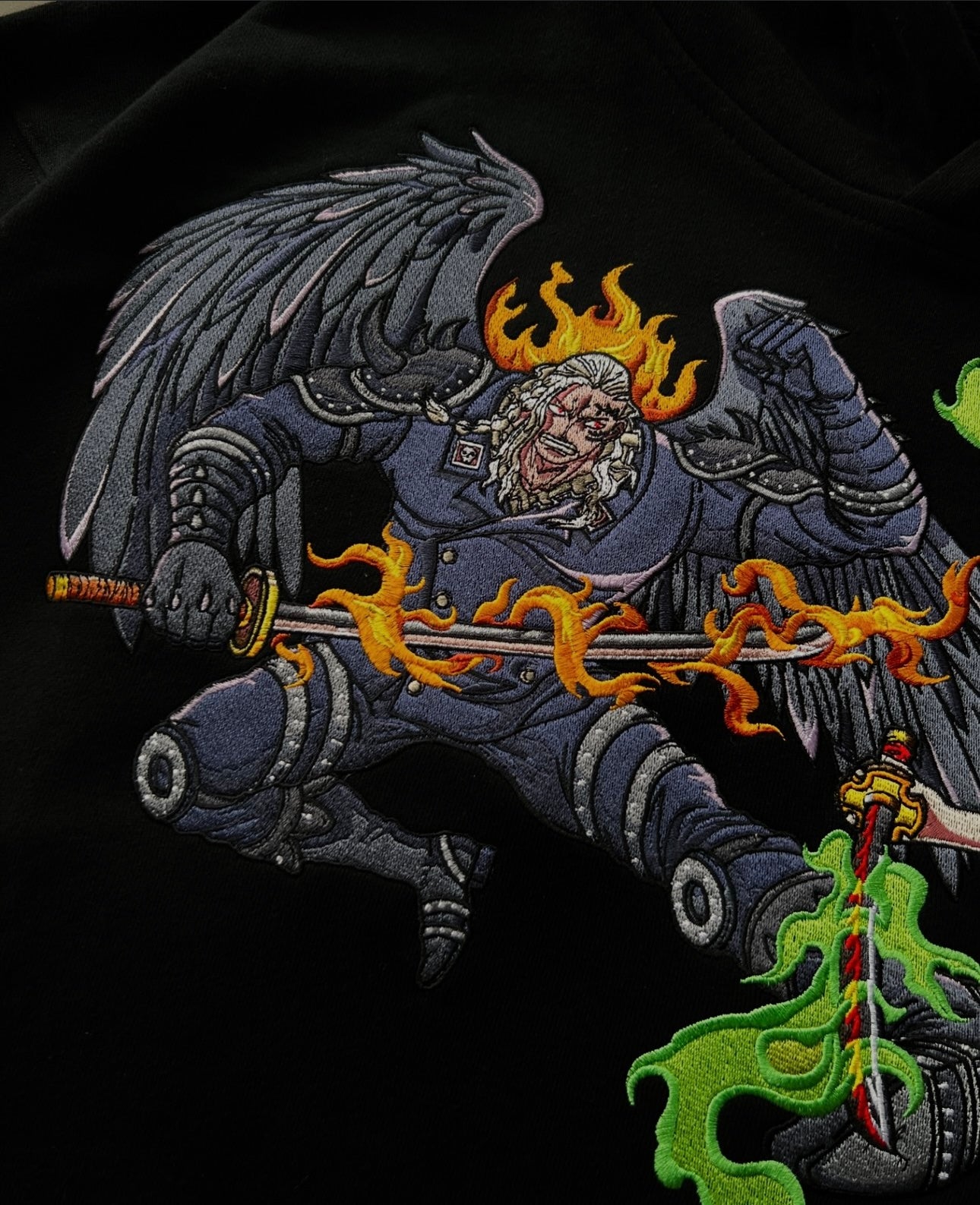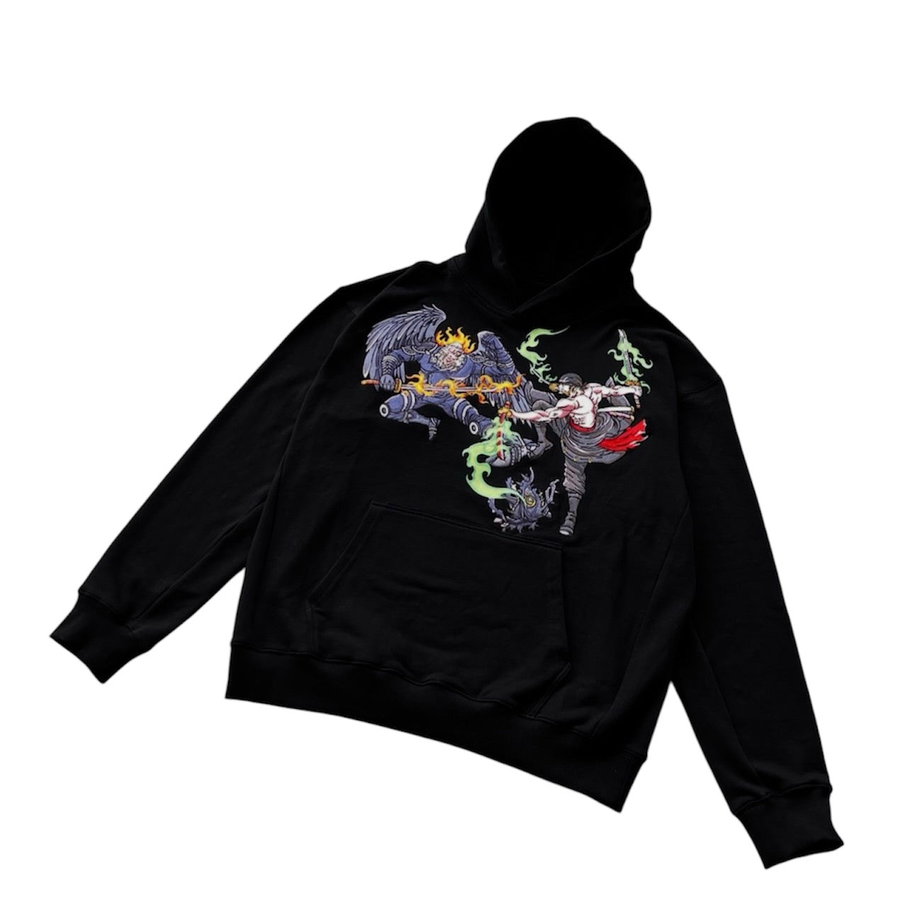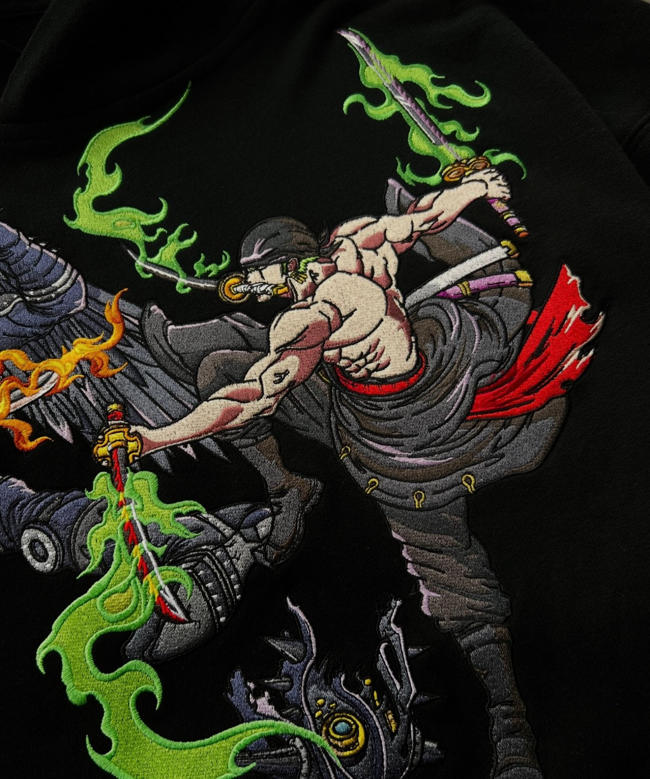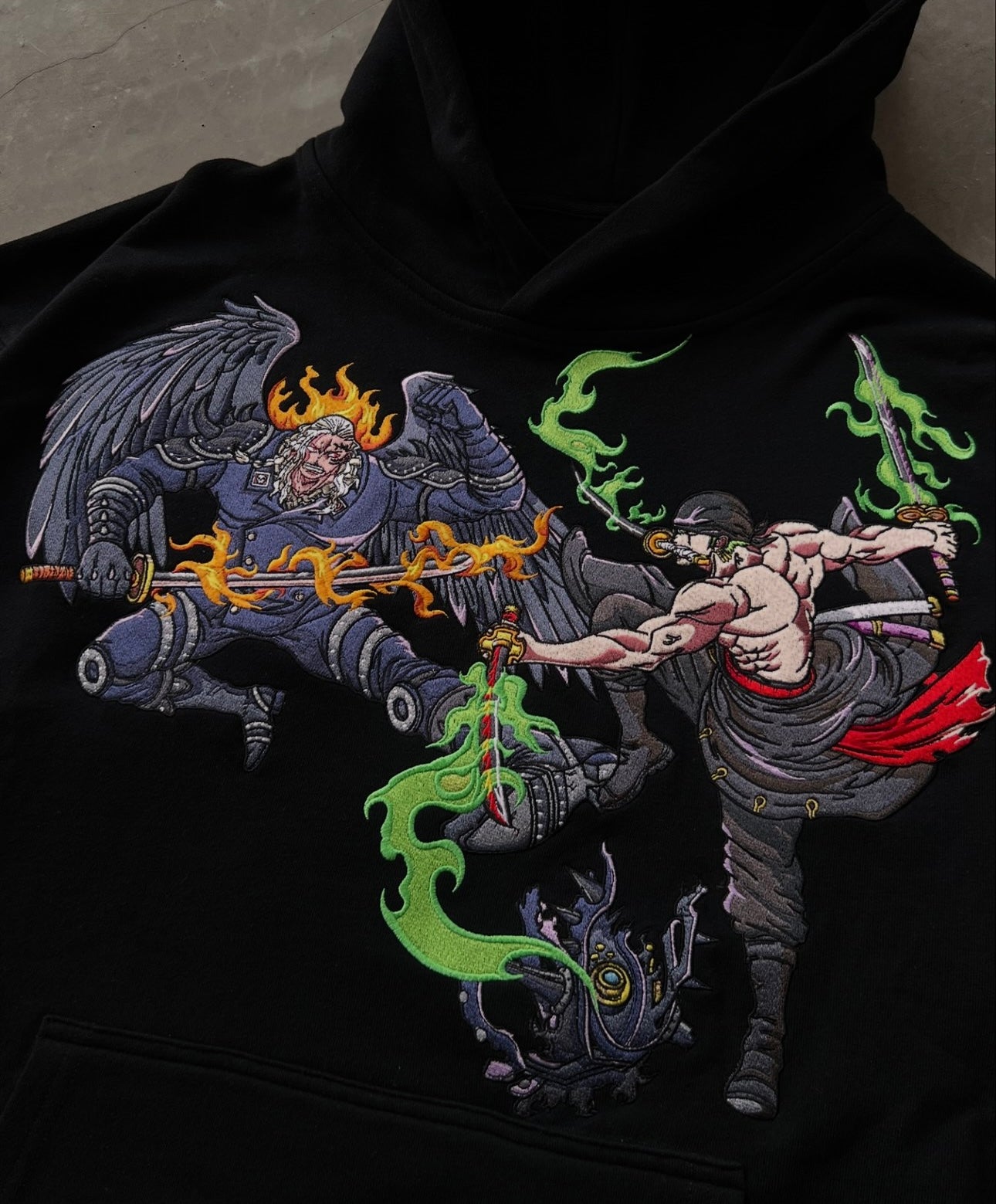 The front of the hoodie boasts detailed designs of Zoro’s iconic three swords, while the back features a stunning embroidered scene of the epic clash between Zoro and King, with flames and swords capturing the energy of the fight. In a bold, dark color scheme that mirrors the intensity of the battlefield, this hoodie is the perfect tribute to one of the most thrilling moments in the Wano Arc. Comfortable, stylish, and battle-ready—show off your love for with this legendary piece of gear!