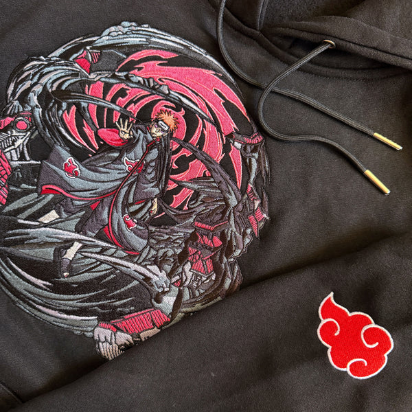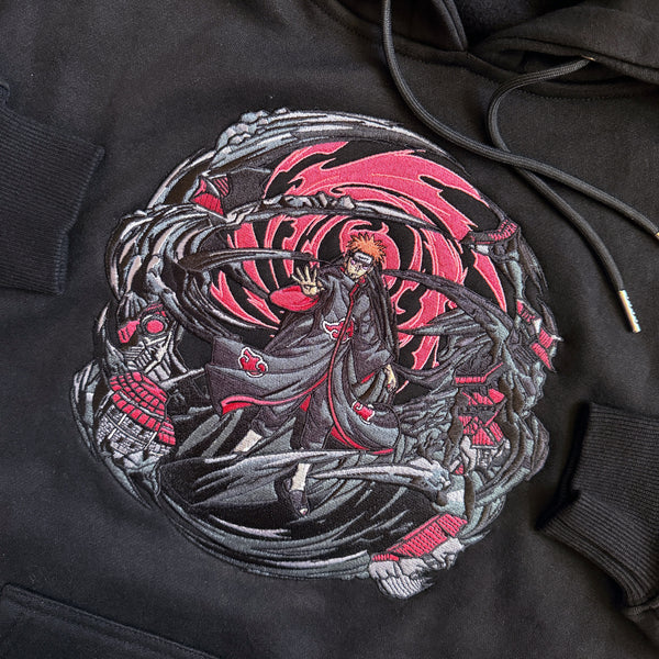 Channel strength and determination with the Pain ST Black Embroidered Hoodie. Perfect for fans who want to showcase their love for anime in style.